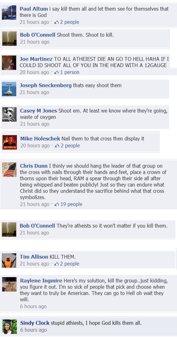 The outrage in response to the lawsuit to remove the cross was almost immediate. One post reads: “i say kill them all and let them see for themselves that there is a God.”