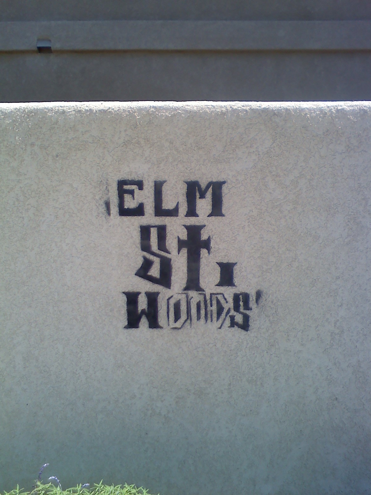 Earlier today, Anna left her daughter at home to have breakfast with a friend. She arrived home to see the words “Elm St. Woods” with a the “T” looking like a cross on the wall facing the site of the earlier cross burning.