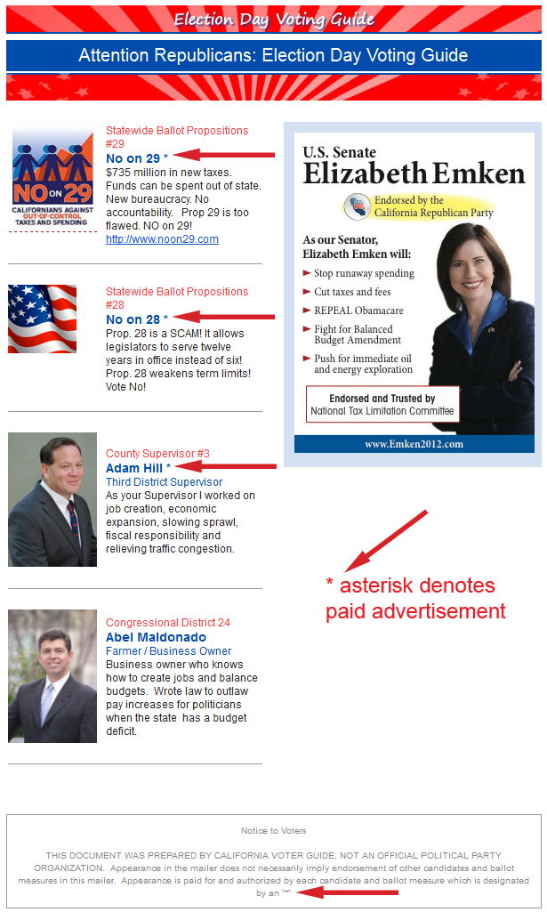 “The mailer is a clear example of deceptive politics,” said Christopher Arend, a members of the San Luis Obispo County Republican Party. “Most voters are too busy to give mailers more than a quick look, and this mailer uses this to create an impression that it has been issued by a Republican organization.”