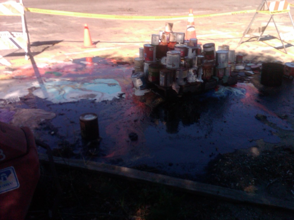 Chemicals seeped from cans to a strip of wood separating the asphalt from the soil. Picture taken one week after discharge.