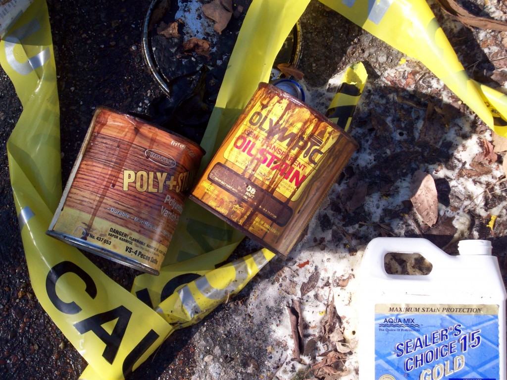 Chemicals seeped from cans to a strip of wood separating the asphalt from the soil. Picture taken one week after discharge.