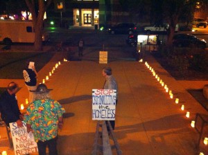 A group of San Luis Obispo citizens who oppose the city’s ongoing harassment of the homeless lit 74 candles Tuesday evening on and around city hall steps in honor of the roughly 740 people they estimate take shelter nightly in vehicles parked on city streets.
