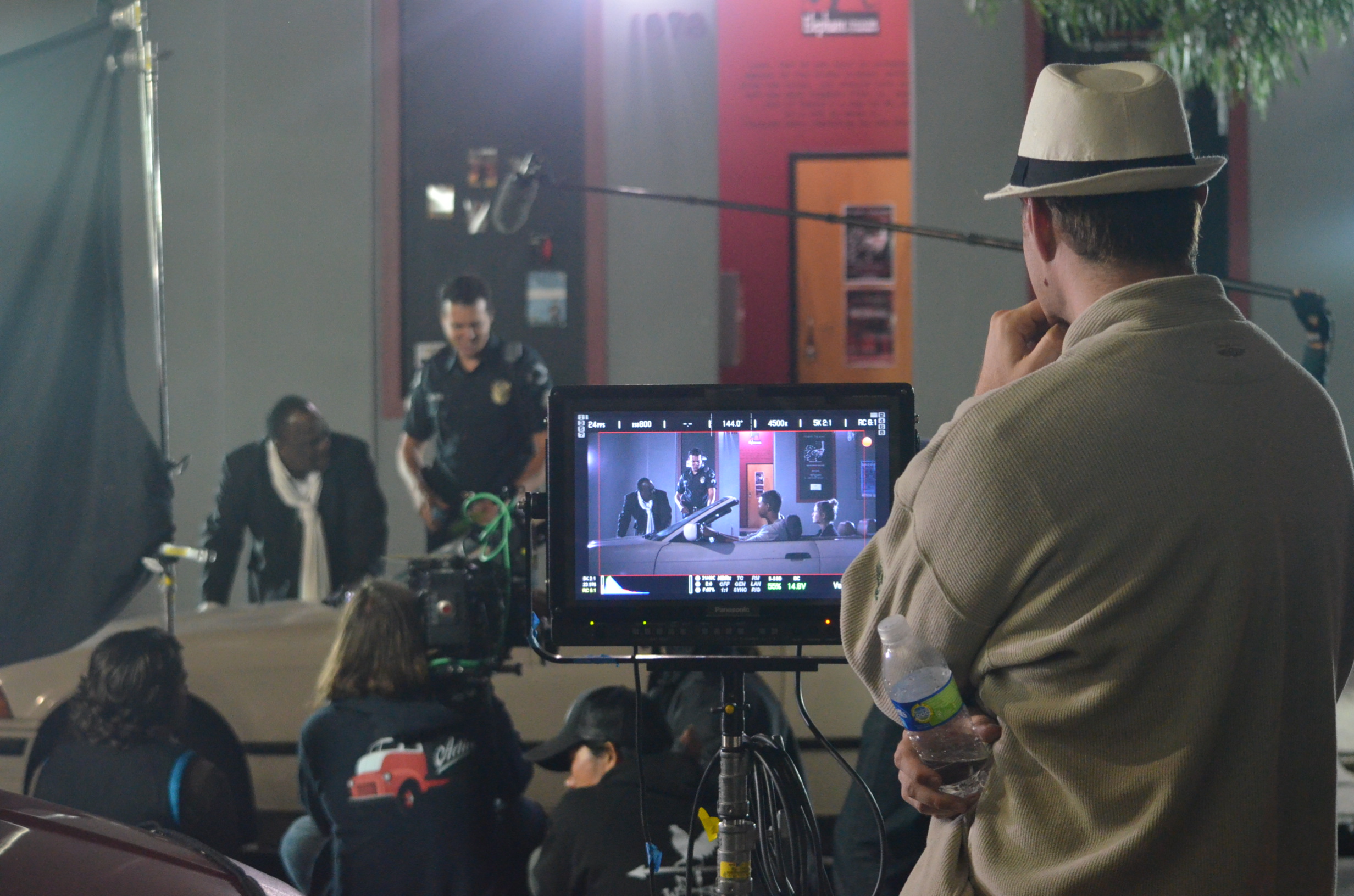“Since our film is a Road Movie, our heroes drive (U.S. Highway)101 south through the Central Coast making a pit stop at the liquor store in Pismo Beach, where after the conversation about flip-flops, our female protagonist reveals to the male protagonist she is in fact color blind and that her vision is limited to only seeing shades of gray.”