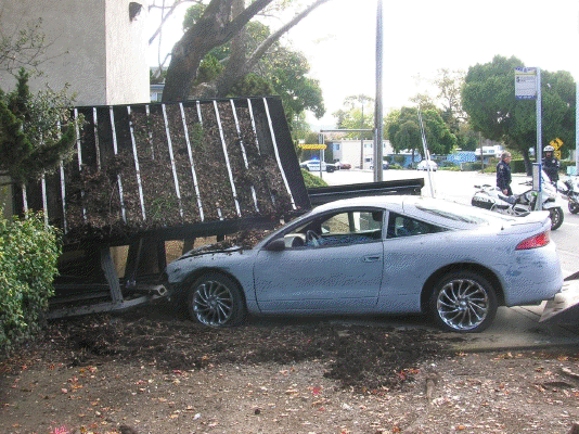 The improperly secured Mitsubishi Eclipse rolled off a flatbed truck onto Highway 101, took the Grand Avenue exit, crossed Grand Avenue and plowed into a city bus stop.