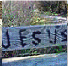The graffiti includes statements such as Jesus loves you and I am with Jesus.
