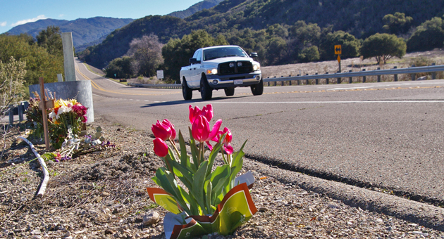 Flowers have been placed at a roadside memorial on Highway 154 where two women were killed after being struck by vehicles. Photo by Tom Bolton, courtesy of Noozhawk.