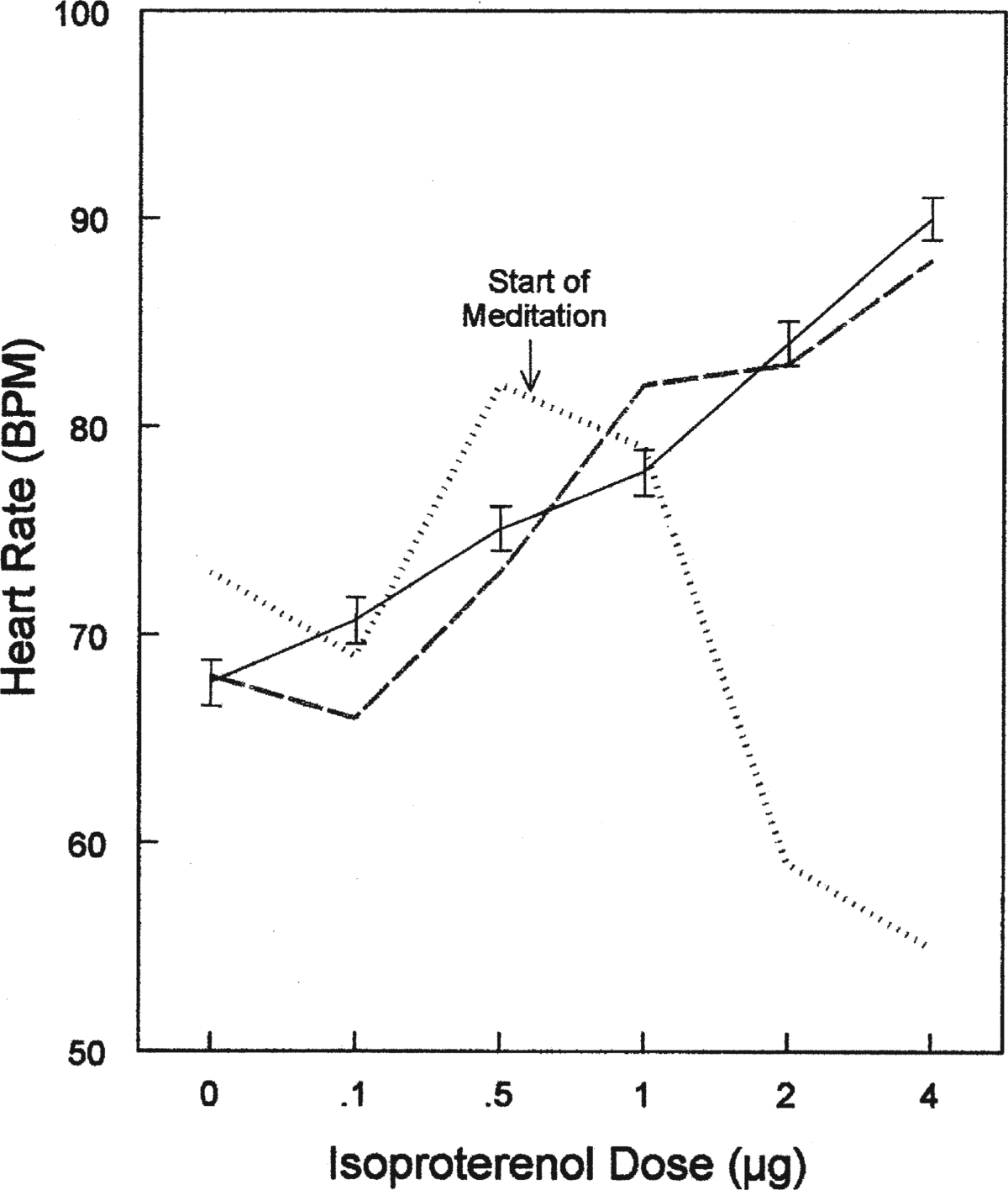 Effects of meditation on chronotropic responses to isoproterenol. (Solid line) Mean ± standard error response to isoproterenol in 93 women; (dotted line) patient’s response while meditating; (dashed line) patient’s response while instructed not to meditate. BPM = beats/min; HR = heart rate.