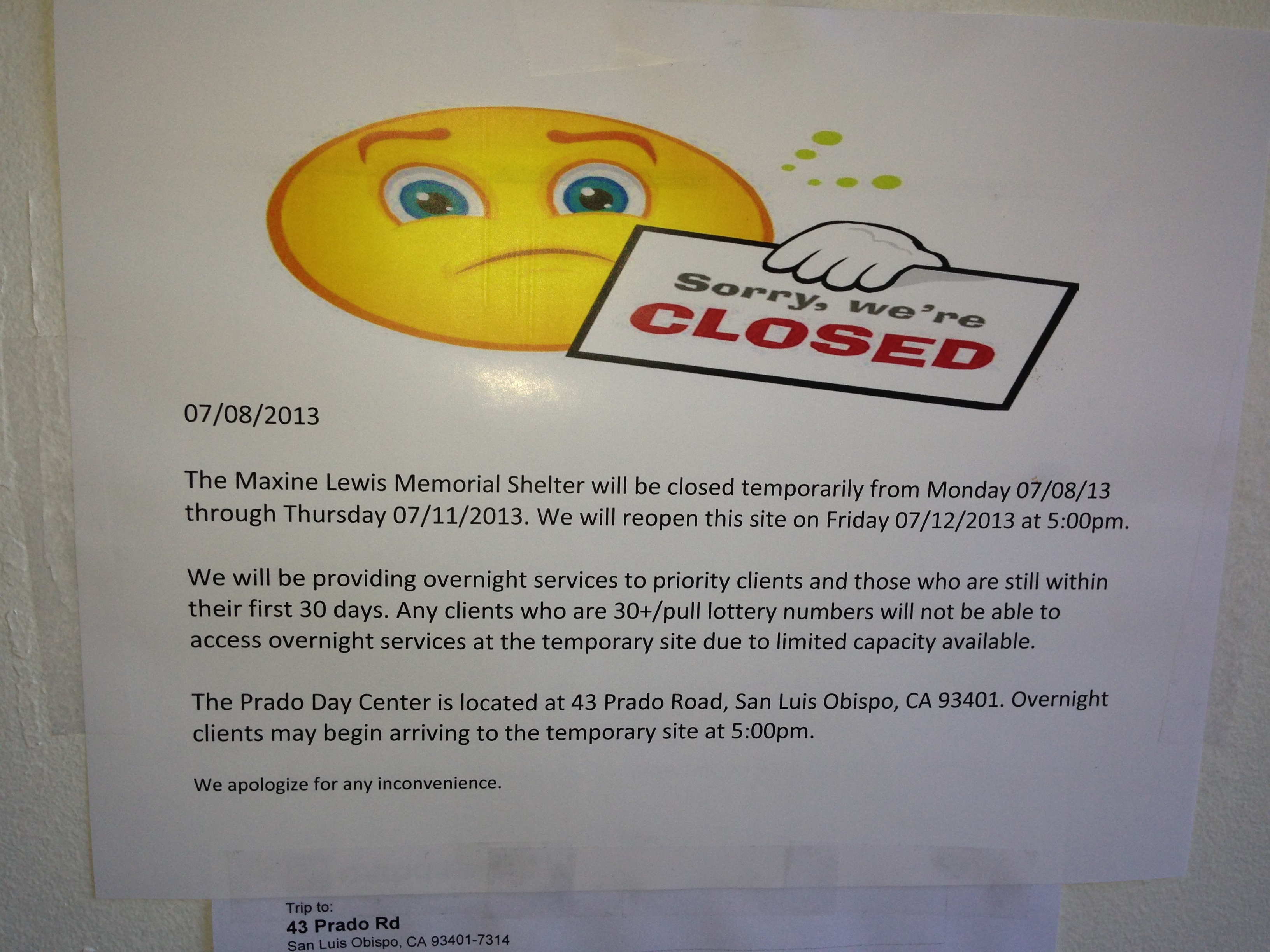 The sign on the shelter door states that CAPSLO will allow clients who have priority, as well as those who have spent fewer than 30 days in the shelter, to stay overnight at the Prado Day Center during the closure. Those without priority will have to fend for themselves.