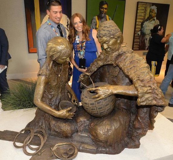 “Tradition” is a sculpture that shows a tribal elder sharing the technique of weaving a finely coiled juncus basket, reminding us that Chumash were known for remarkable basketry techniques.