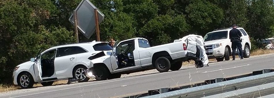 At about 2:46 p.m., 51-year-old Perry Aanerud of San Luis Obispo was driving northbound when his Mitsubishi pickup truck veered right onto the dirt, he over corrected and the truck crashed into the center guardrail ejecting his passenger, Brian Amgles, onto the ground. The vehicle then shot back into traffic and a white SUV crashed into the side of the truck.