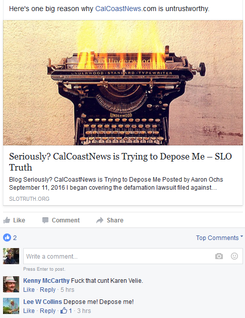 Within hours of the launch of Cal Coast Fraud, Hill was asking people to participate on the page that included posts claiming CCN reporters needed to lose court cases in order to protect the county from the stories CCN produces.