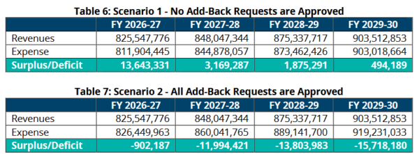 If all add-back requests are approved, the county faces a $902,187 deficit in the 2026-2027 fiscal year and a $11,994,421 budget gap in the 2027-2028 fiscal year.