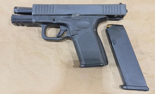Officers checked the surrounding area and found a concealed firearm hidden under a fence. Police identified the weapon as a Glock-style 9 mm handgun with no serial number and a loaded magazine containing 17 rounds of ammunition.