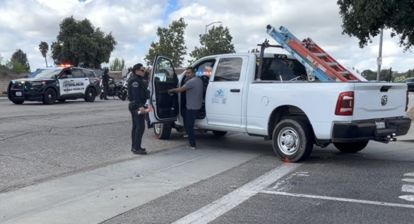 The driver of a white Dodge pickup truck collided with a pedestrian in the 1400 block of Creston Road at approximately 2:26 p.m. The collision occurred outside the shopping plaza where Food 4 Less is located.